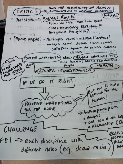 The image above provides a photo of flip chart writing which summarised of some of the discussion from the round table work (expanded on in the text below). We explored how critics from the outside are often coming from an ‘animal rights’ perspective; some of the biggest critics of equestrian sports can come from within the field; issue of conservatism and tradition and how that plays out in different country contexts addressed by discussion of how Sweden increases access to horse sports (compared to many countries) because of how children are invested in including in relation to sport. This can mean that engagement with horses connects more people in some countries (e.g. Sweden) than others.